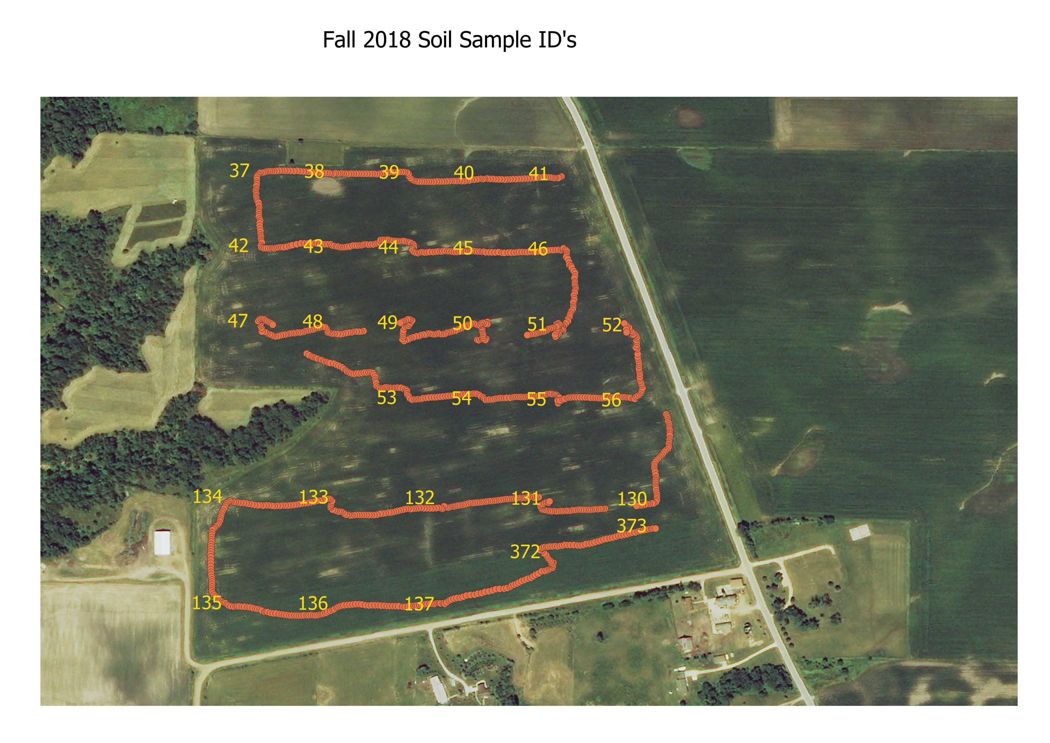 I took soil samples on a 2 1/2 acre grid using my soil sampling app to guide me to the spots. You can see my travel pattern through the field.