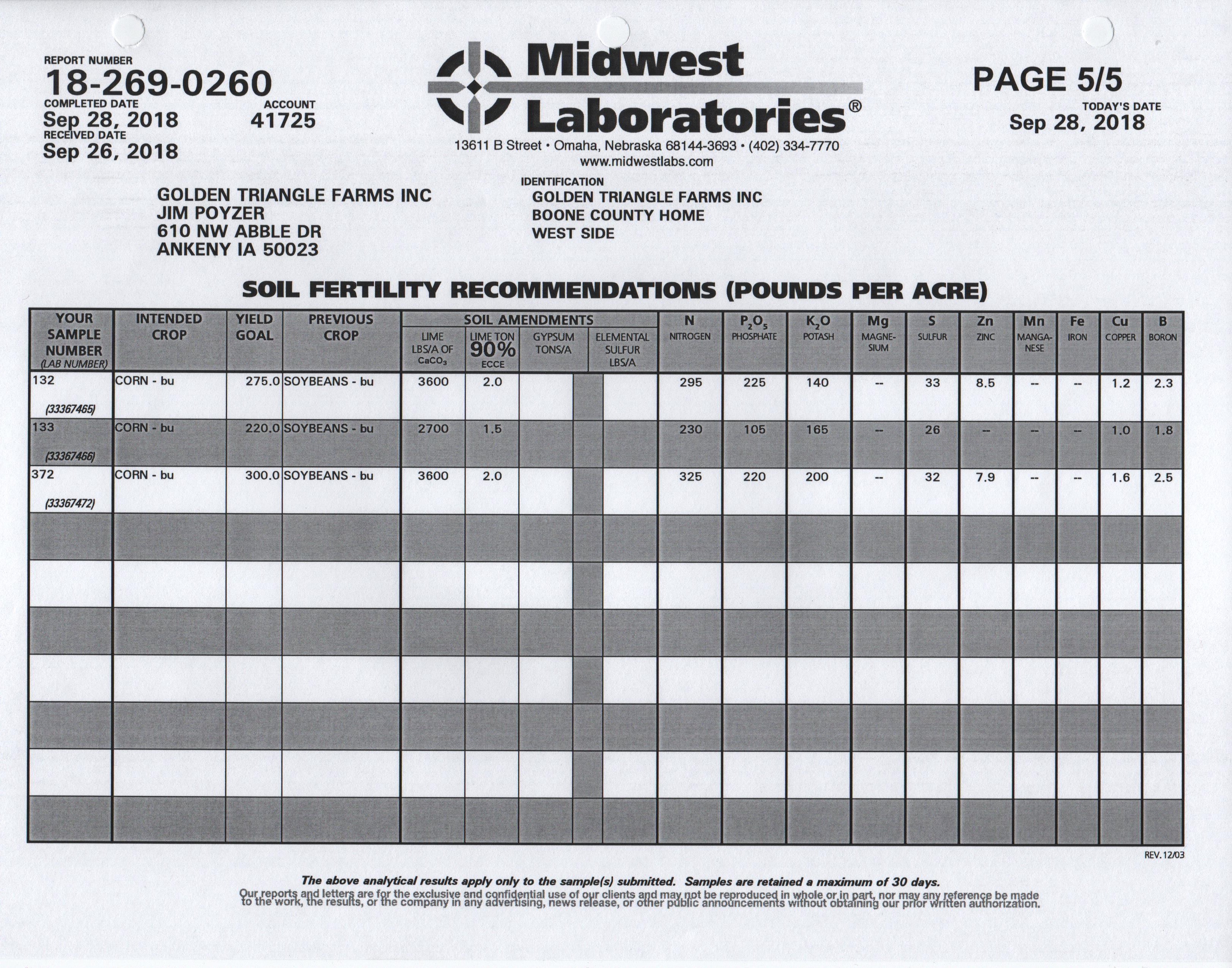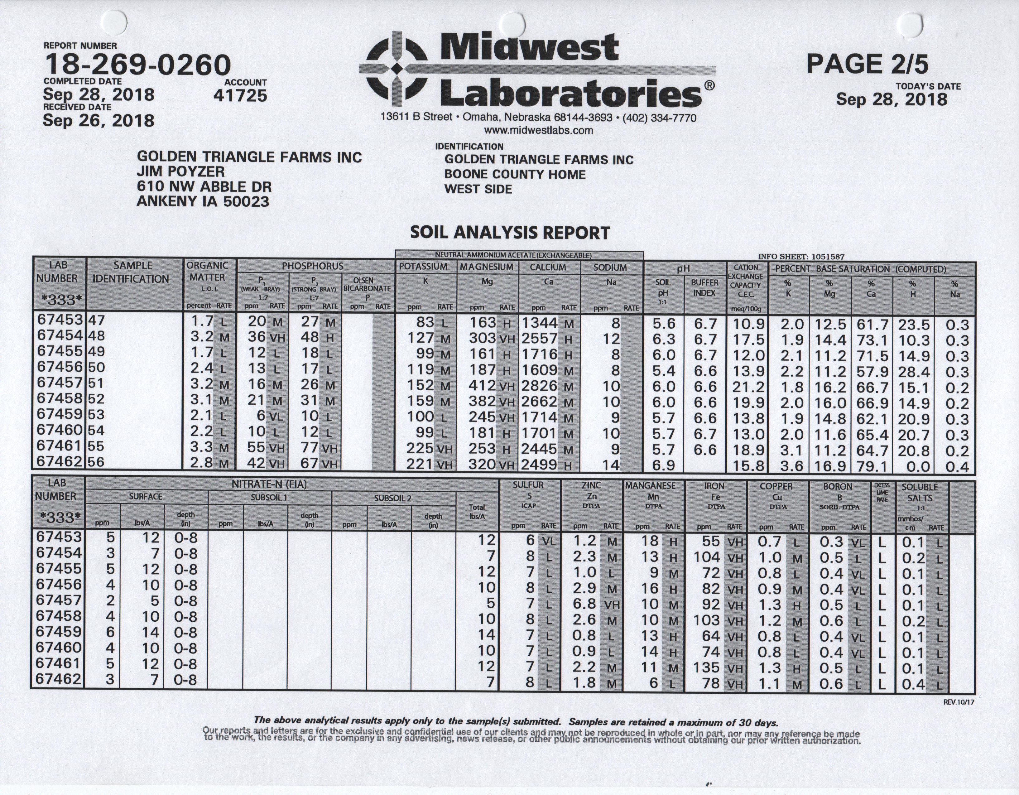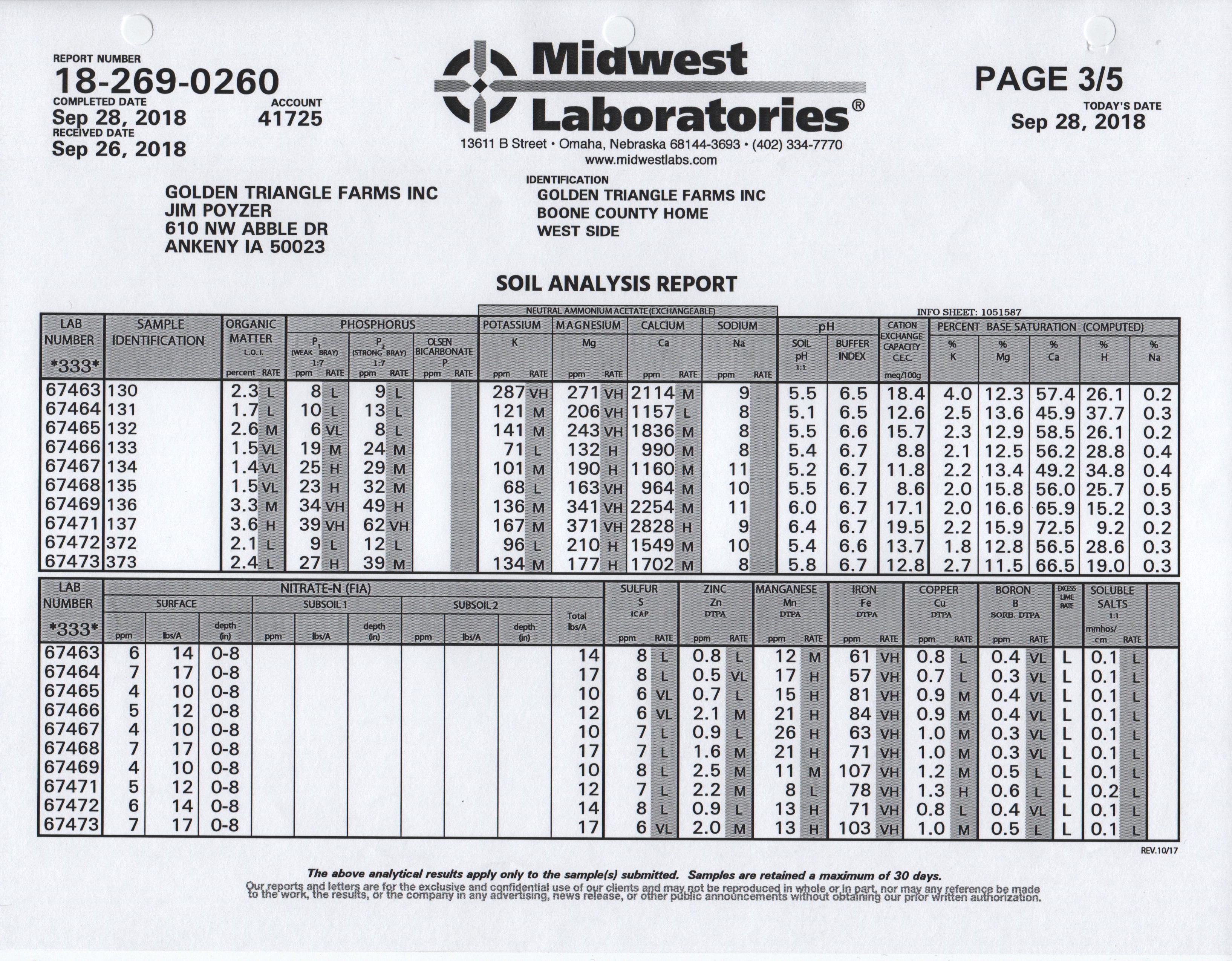 Samples were sent to Omaha for analysis. Besides the reports you see here, I requested the information in a .csv format that I could import into a spreadsheet for